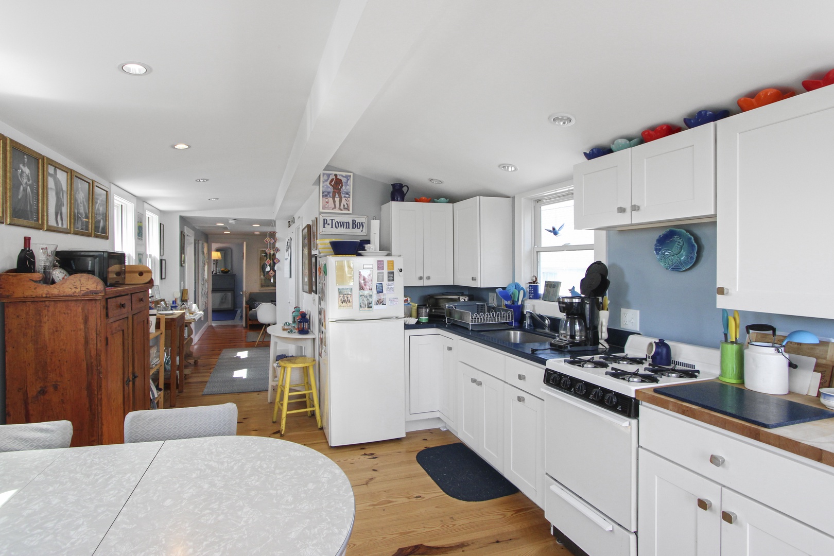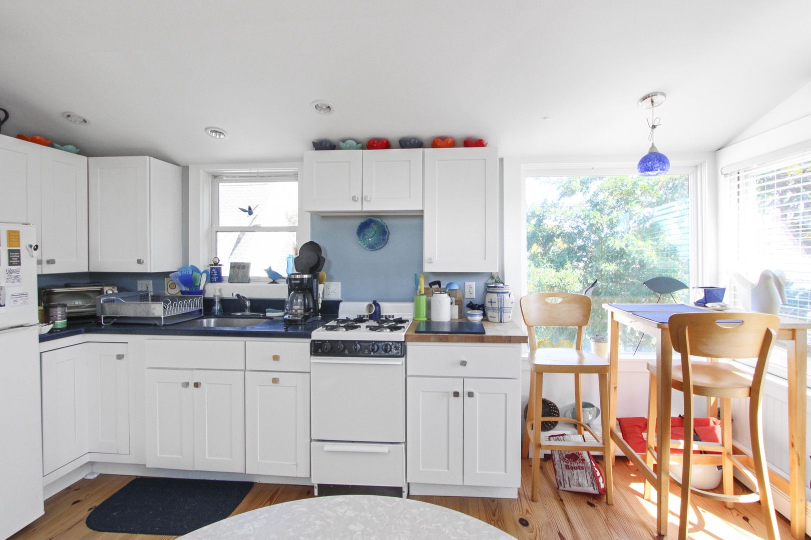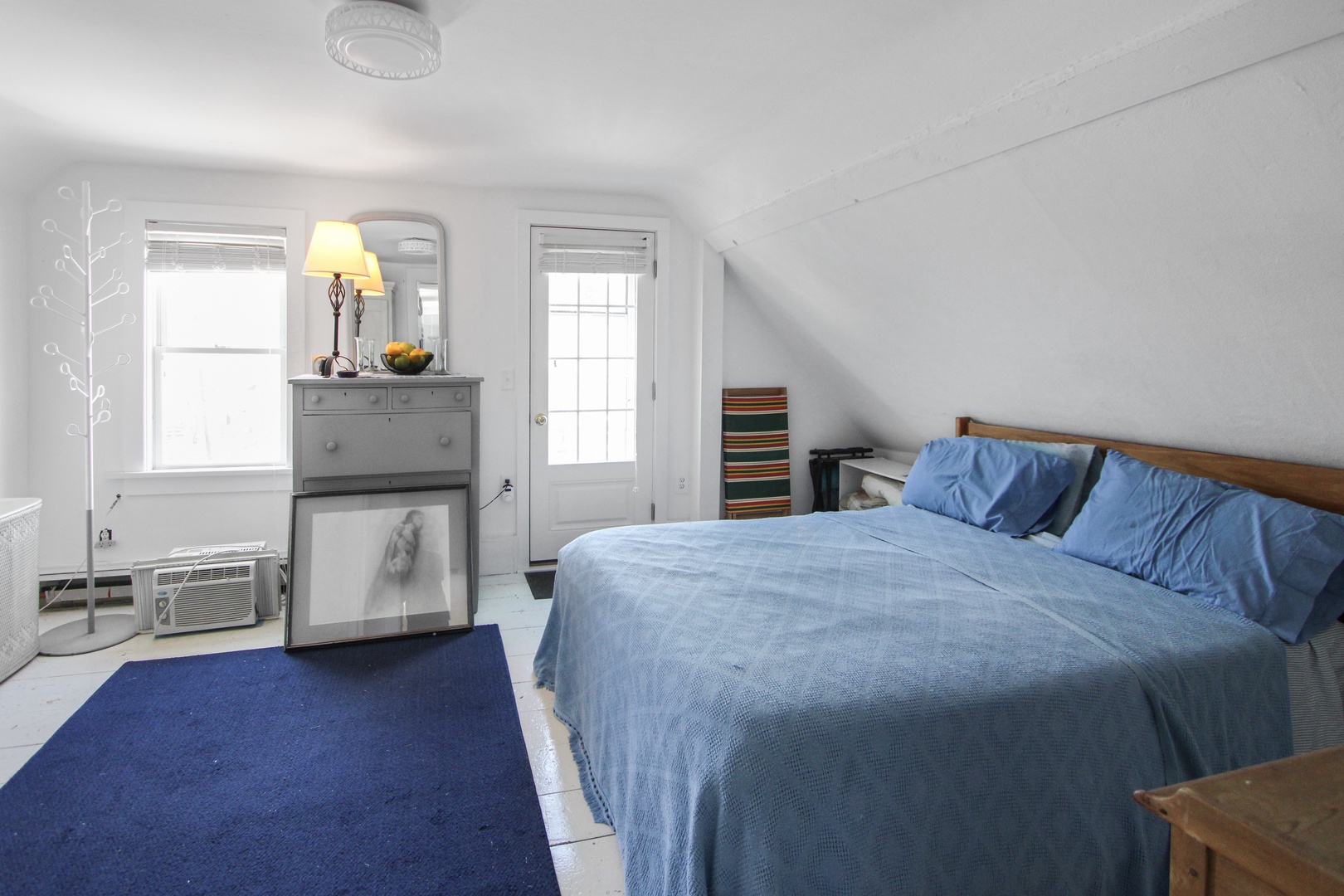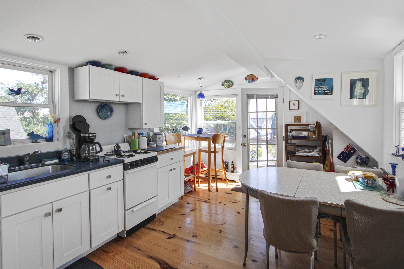 Quaint top floor one bedroom with charming bead board. The kitchen has two dining options, a kitchen table or a high-top. Large bedroom with queen-size bed and private deck with an electric grill as well as peaks of the water.