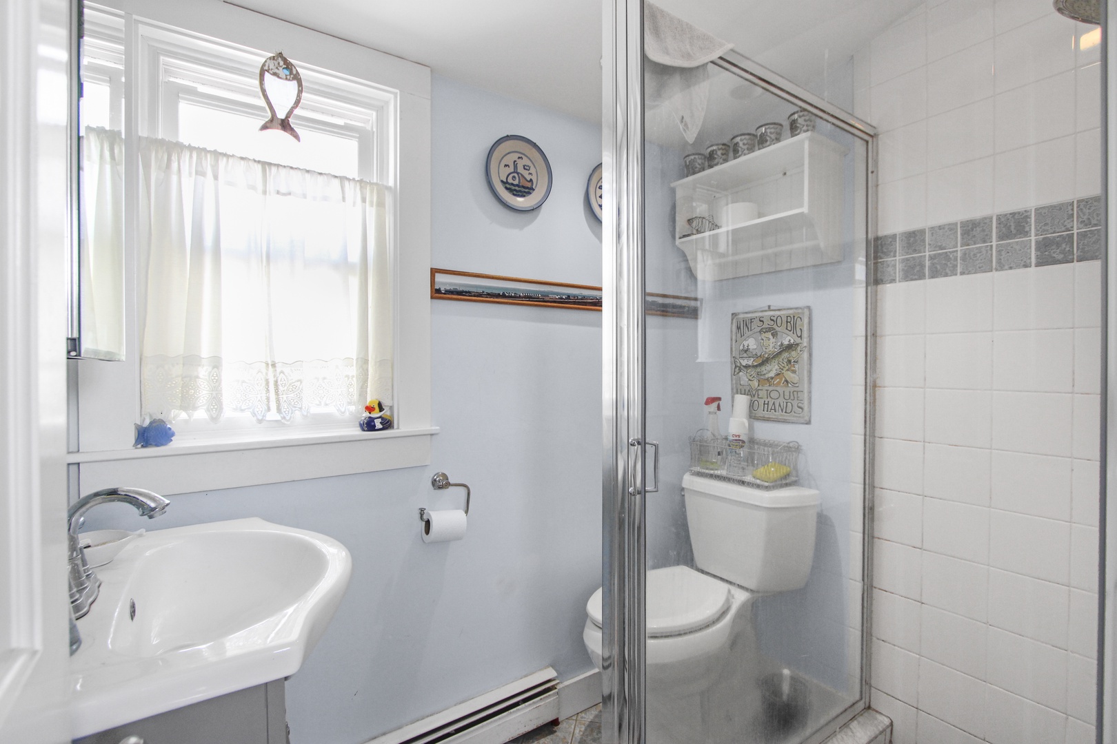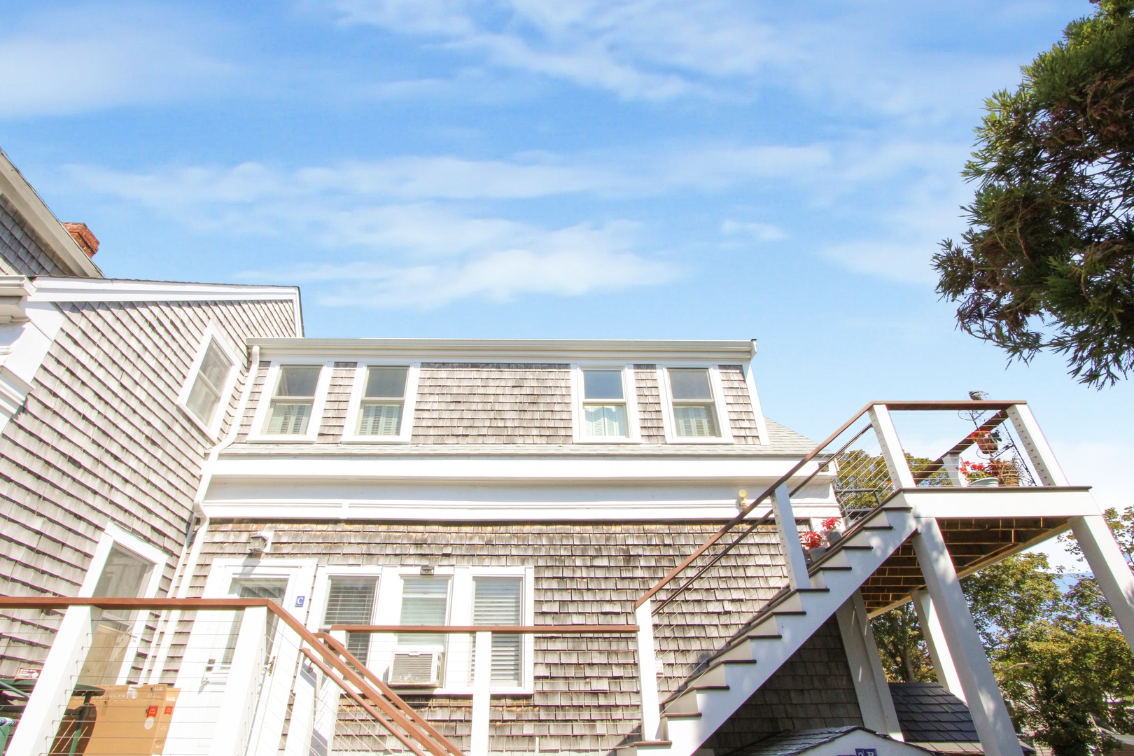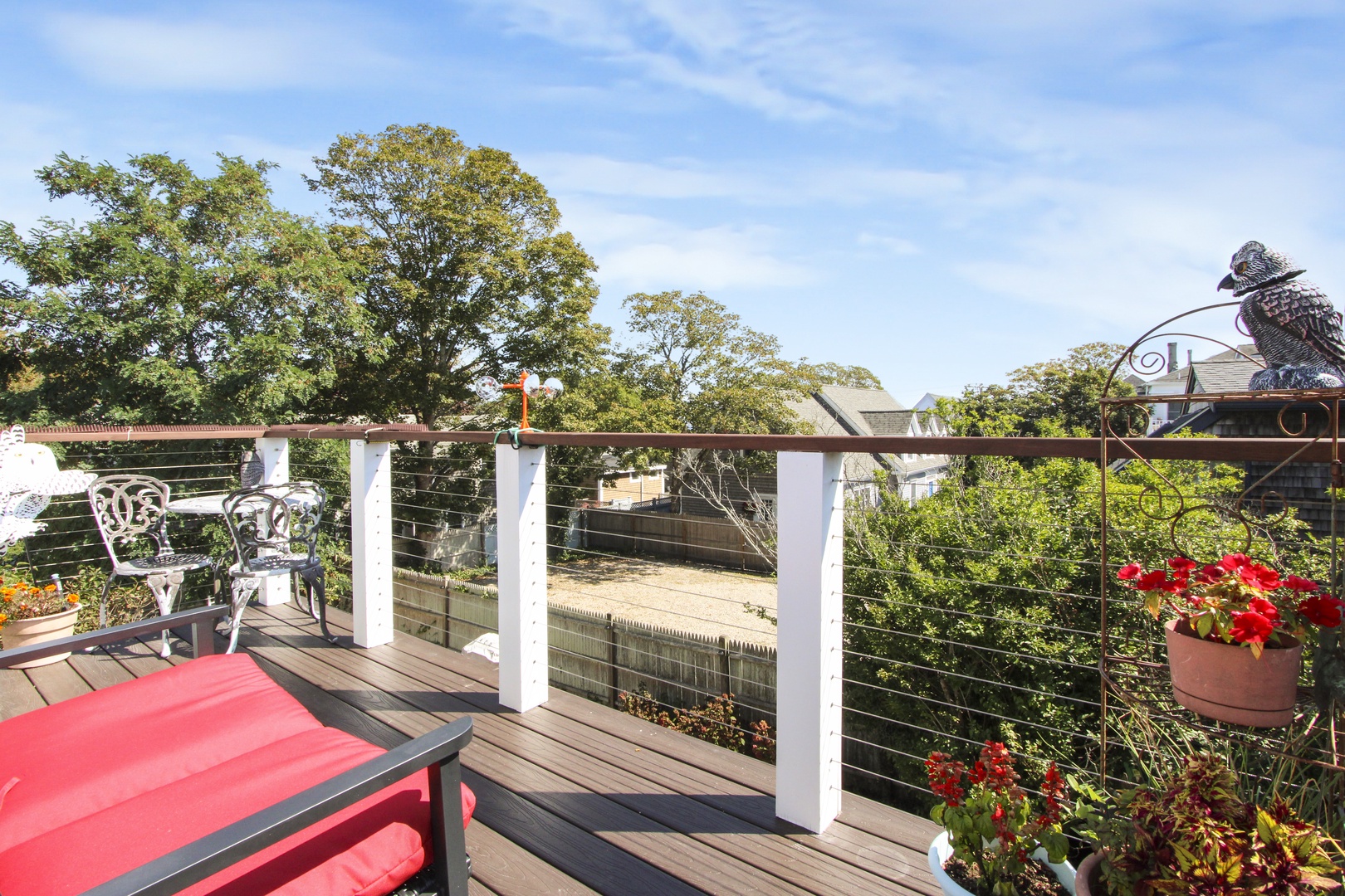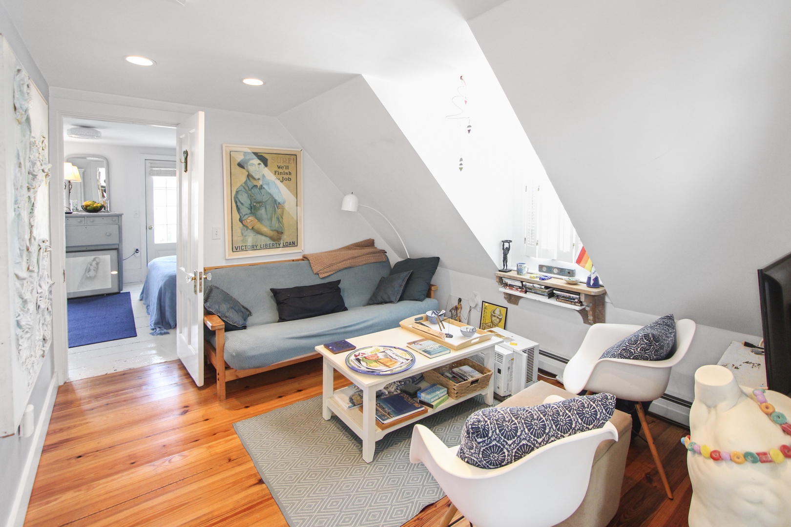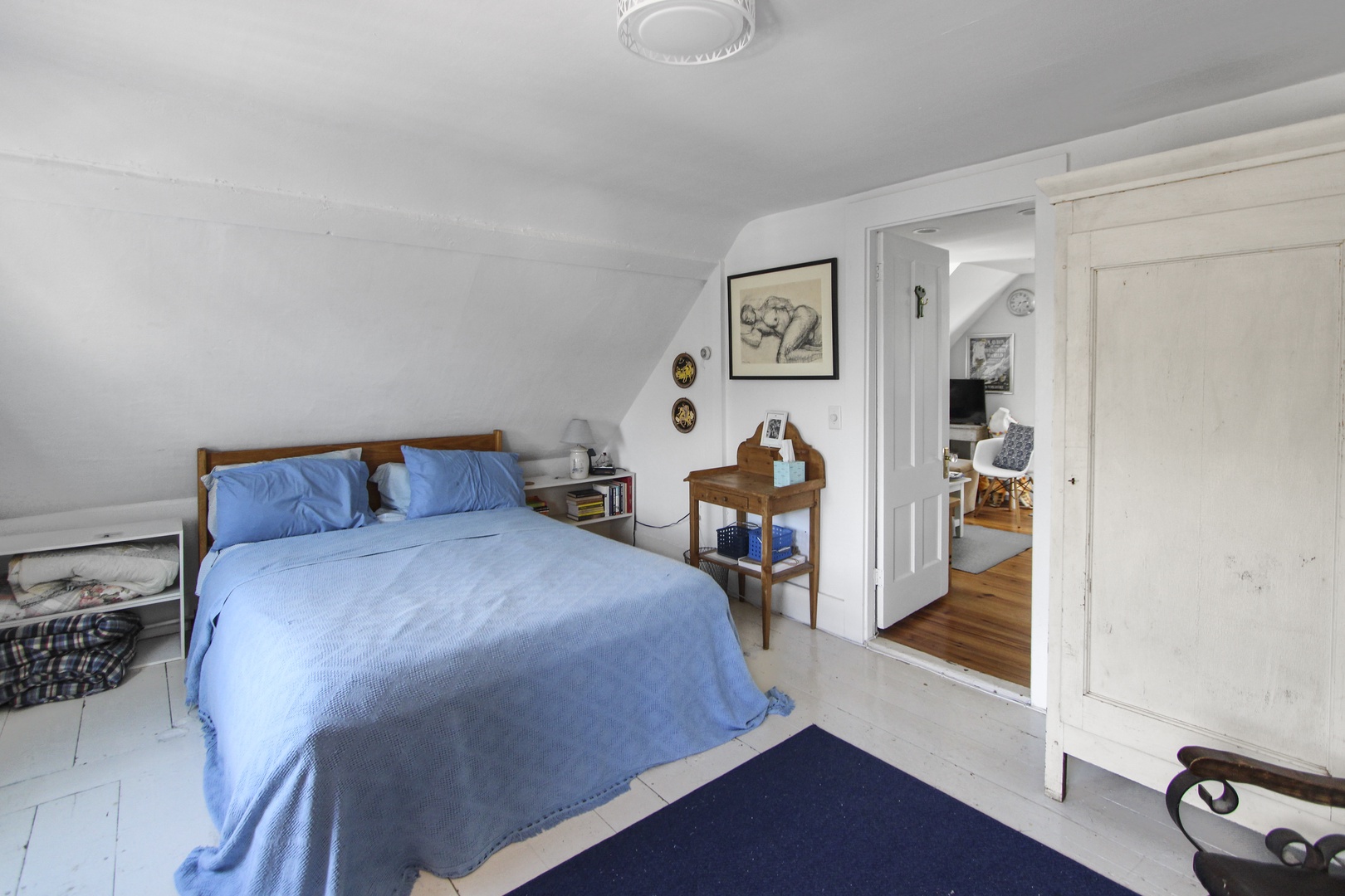Quaint top floor one bedroom with charming bead board. The kitchen has two dining options, a kitchen table or a high-top. Large bedroom with queen-size bed and private deck with an electric grill as well as peaks of the water.